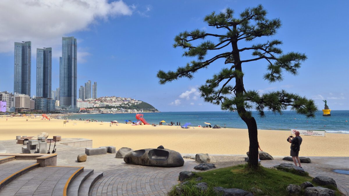 Nach dem Tempelbesuch fuhren wir an einen von zwei großen Stränden in Busan: den Haeundae Beach. Der wunderschöne, bis zu 50 Meter breite und natürlich wieder durch und durch gepflegte goldgelbe Sandstrand wartet dazu noch mit futuristischen Glas- Wolkenkratzern im Hintergrund auf und braucht meiner Meinunge nach den Vergleich mit Waikiki oder Miami Beach nicht zu scheuen! Während wir die blitzsaubere Strandpromenade entlang wandelten, umwehte uns eine angenehme Meeresbrise – sehr wohltuend bei dem immer noch über 30 Grad warmen Sommerwetter! Und natürlich sorgte die frische Meeresluft auch gleich für den entsprechenden Appetit: