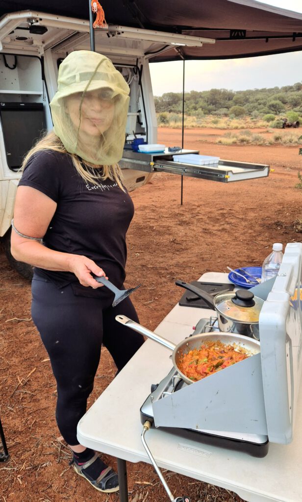 Ich bereite gerade das Essen vor und habe dabei das Gefühl, dass mehrere Fliegen versuchen, mir in die Augen, Ohren und den Mund zu krabbeln. Sie sind wirklich überall, schwirren in Schwärmen um einen herum und versuchen sogar, in die Nase zu kriechen. Nicht gerade angenehm! Bis zum Sonnenuntergang herrscht im Outback Australiens eine wahre Fliegenplage. Dann hilft nur noch ein Fliegennetz für das Gesicht, und das setzen wir auch brav auf. Nach Sonnenuntergang sind sie plötzlich verschwunden, um dann am nächsten Morgen bei Sonnenaufgang wieder fröhlich zum Angriff überzugehen. Wir hoffen immer auf ordentlich Wind, dann haben wir weniger Probleme damit.