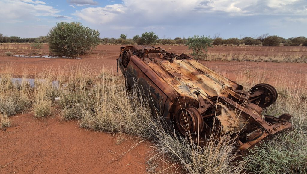 Und natürlich war es einsam. Touristische Sehenswürdigkeiten? Fehlanzeige! Um uns herum nichts als endloser Busch. Pro Tag begegneten wir nur einer Handvoll anderer Autos. Jedenfalls fahrenden. Autowracks sahen wir am Straßenrand nämlich zu Dutzenden, wenn nicht Hunderten: verrostet, umgestürzt, ausgebrannt. Wenn man so will, fuhren wir durch eine Art sehr langgestreckten Outback-Autofriedhof.
