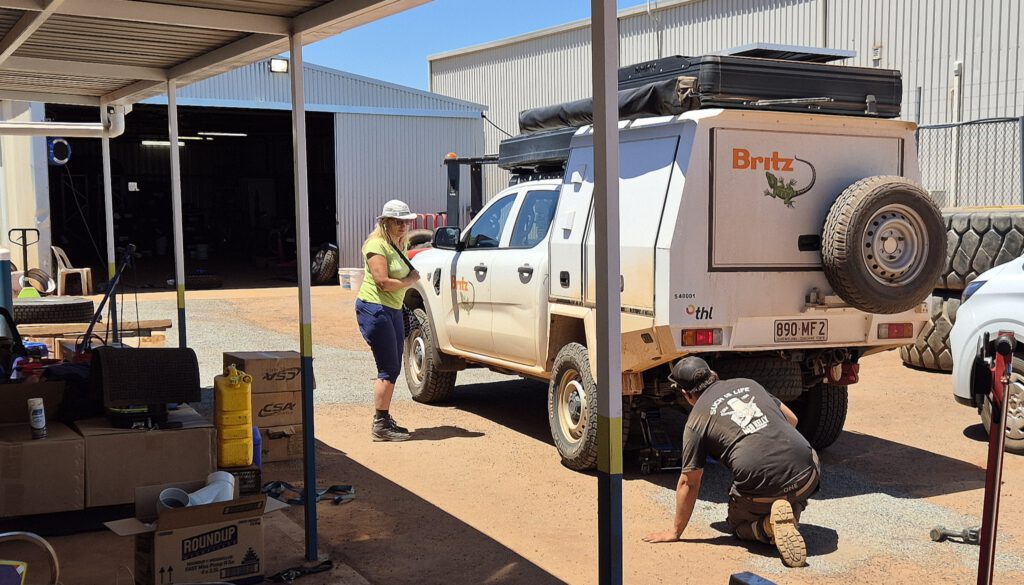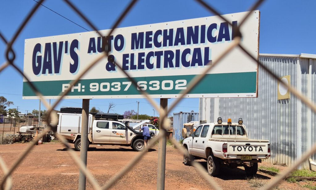 In Leonora angekommen suchten wir die uns genannte Werkstatt auf: „Gav’s Auto Mechanical and Electrical“. Hinter Maschendrahtzaun fanden wir eine kleine schmucklose Blechhalle umgeben von zahlreichen Autowracks und -teilen. Es wirkte eigentlich mehr wie ein Autofriedhof als eine Werkstatt. Aber der Mechaniker Gav selber, ein ergrauter Mittfünfziger, war die Freundlichkeit in Person und eilte uns umgehend zu Hilfe. Nachdem wir unser Problem geschildert hatten, fand er quasi umgehend heraus, dass die Zuleitungen zur 2. Autobatterie äußerst lose saßen, was die Probleme beim Aufladen erklärte. Zu unserer großen Erleichertung war dieses Problem in wenigen Minuten gelöst.