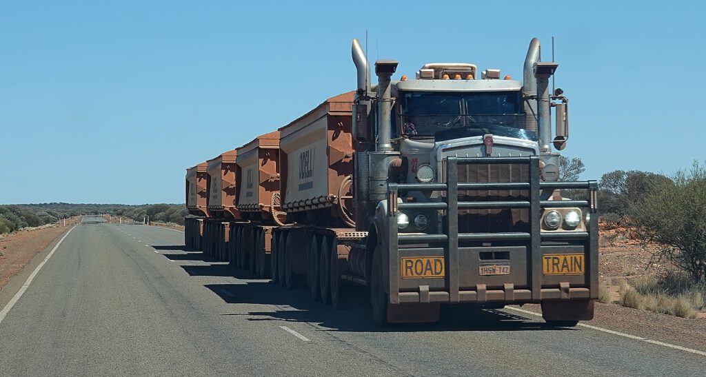 Roadtrains, riesige Lastwagen mit bis zu 4 Anhängern. Wenn man ihnen auf einer Schotterstraße begegnet, muss man zur Seite fahren, denn sie verursachen eine riesige Stein- und Staubwolke und bremsen nicht.